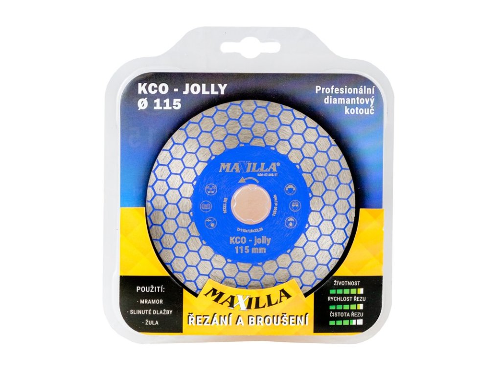 Maxilla KCO - jolly v sobě kombinuje řezný i brusný kotouč, díky této kombinaci je vhodný pro řezání jolly rohů, dlouhých rovných řezů ale i na dobrušování řezů provedených ruční řezačkou. Velmi vysoký segment zajišťuje dlouhou životnost kotouče.