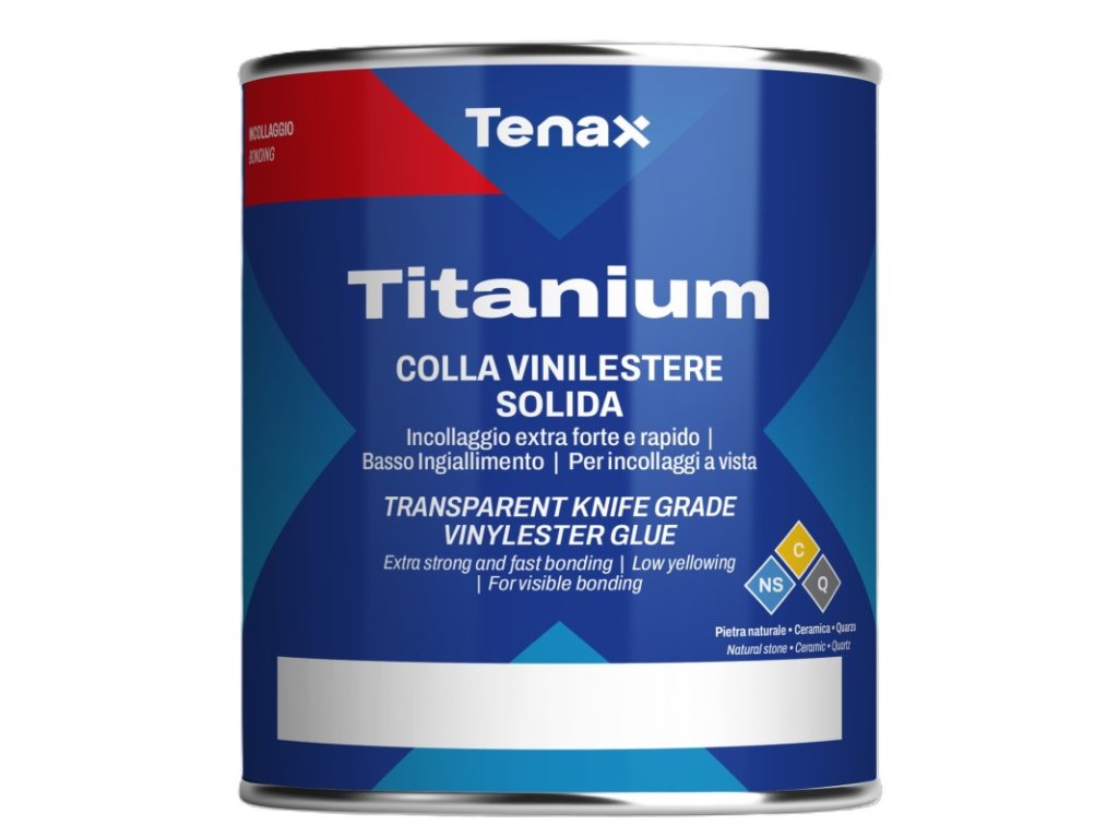 Rigid extra transparent vinyl ester adhesive for bonding granite, marble, quartzite, agglomerates and ceramics in interiors. The adhesive is very fast, with a very clear shade, has a very low yellowing rate and is easy to polish. Can be colored. Easy to apply and spread. The consistency of the adhesive remains rigid even after adding a hardener. TITANIUM EXTRA CLEAR has excellent adhesion in a short time, which allows handling the stone after a very short time, even at low temperatures.