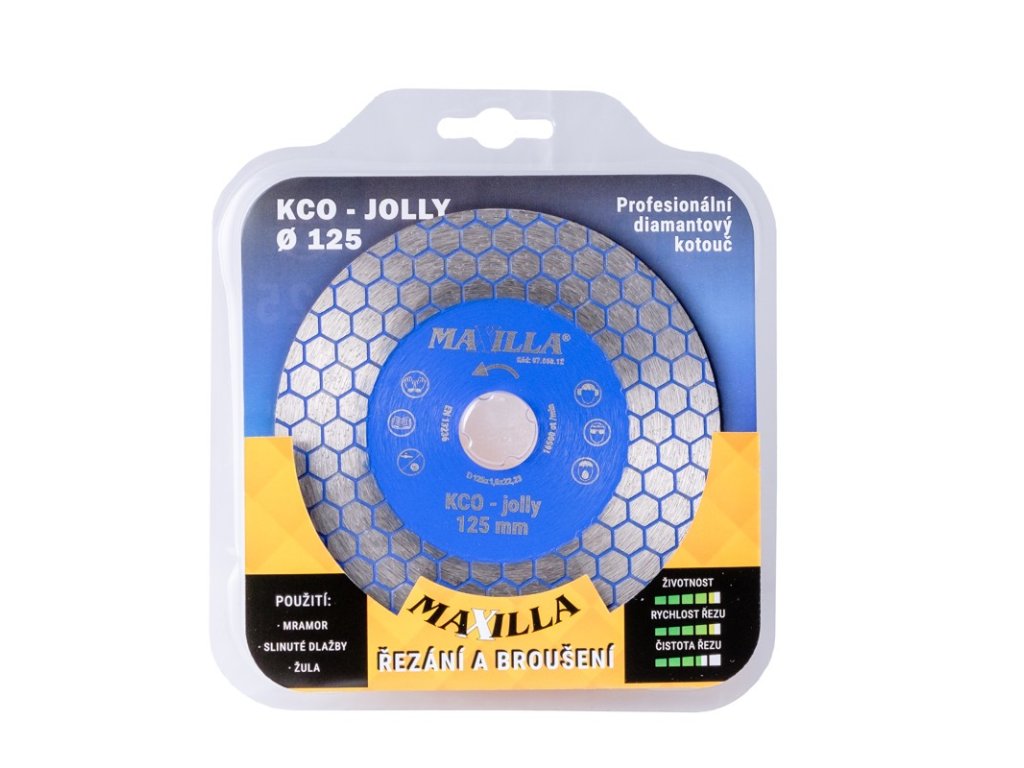 Maxilla KCO - jolly combina una mola da taglio e una da smerigliatura, grazie a questa combinazione è adatta per il taglio di angoli jolly, tagli dritti lunghi ma anche per tagli di finitura eseguiti con una fresa manuale. Il segmento molto alto garantisce una lunga durata della mola.