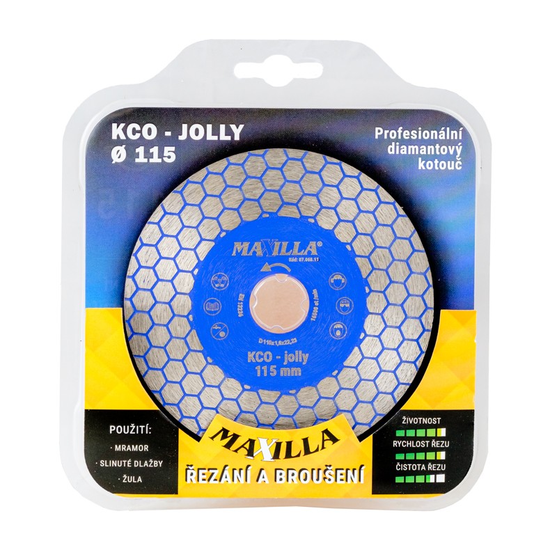 Maxilla KCO - jolly v sobě kombinuje řezný i brusný kotouč, díky této kombinaci je vhodný pro řezání jolly rohů, dlouhých rovných řezů ale i na dobrušování řezů provedených ruční řezačkou. Velmi vysoký segment zajišťuje dlouhou životnost kotouče.
