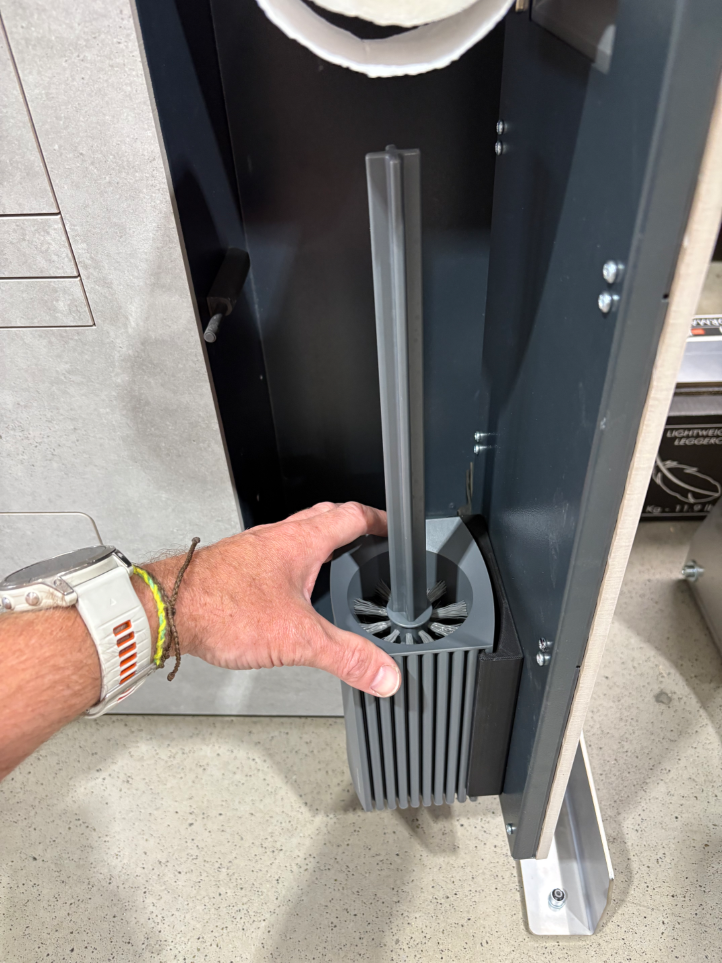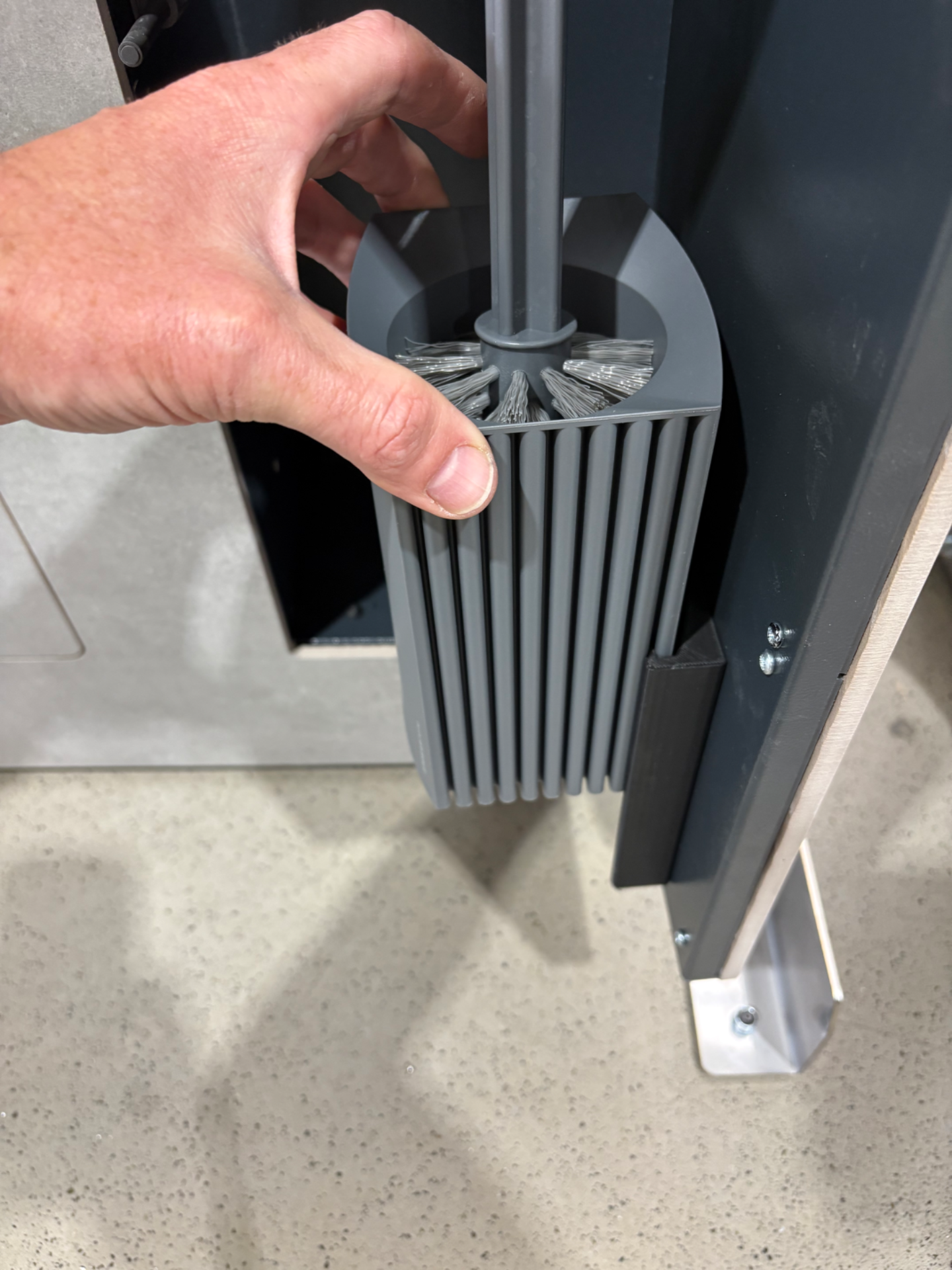 The equipment also includes an integrated toilet brush holder that fits seamlessly into the overall look and a matching toilet brush.
